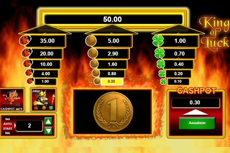 Nach der Festlegung des Einsatzes, dem Start der Drehung (auch Autoplay möglich) und einem dabei erhaltenen Gewinn können Sie selbst entscheiden, ob Sie den Gewinn weiter im Cashpot lassen oder ihn doch lieber einsammeln und somit vor dem bösen Teufelchen in Sicherheit bringen möchten. Taucht auf dem Spielfeld nämlich keines der Gewinnsymbole, sondern das böse Teufelchen auf, sind alle Gelder, die sich noch im Cashpot befinden, verloren.